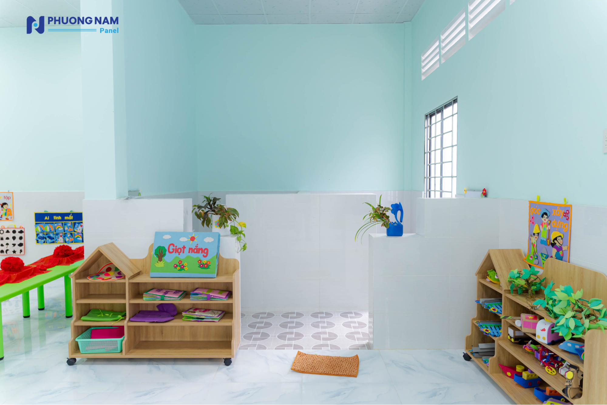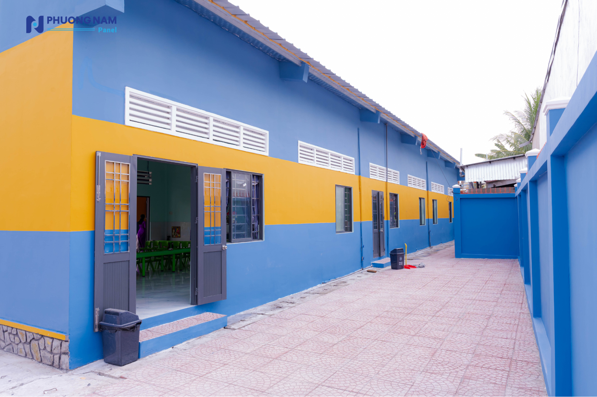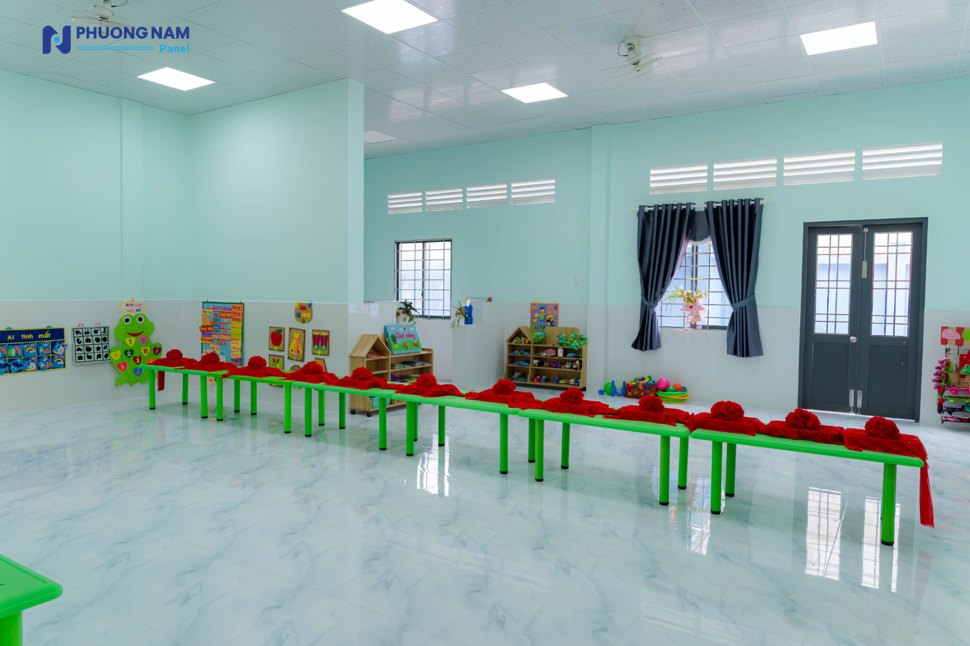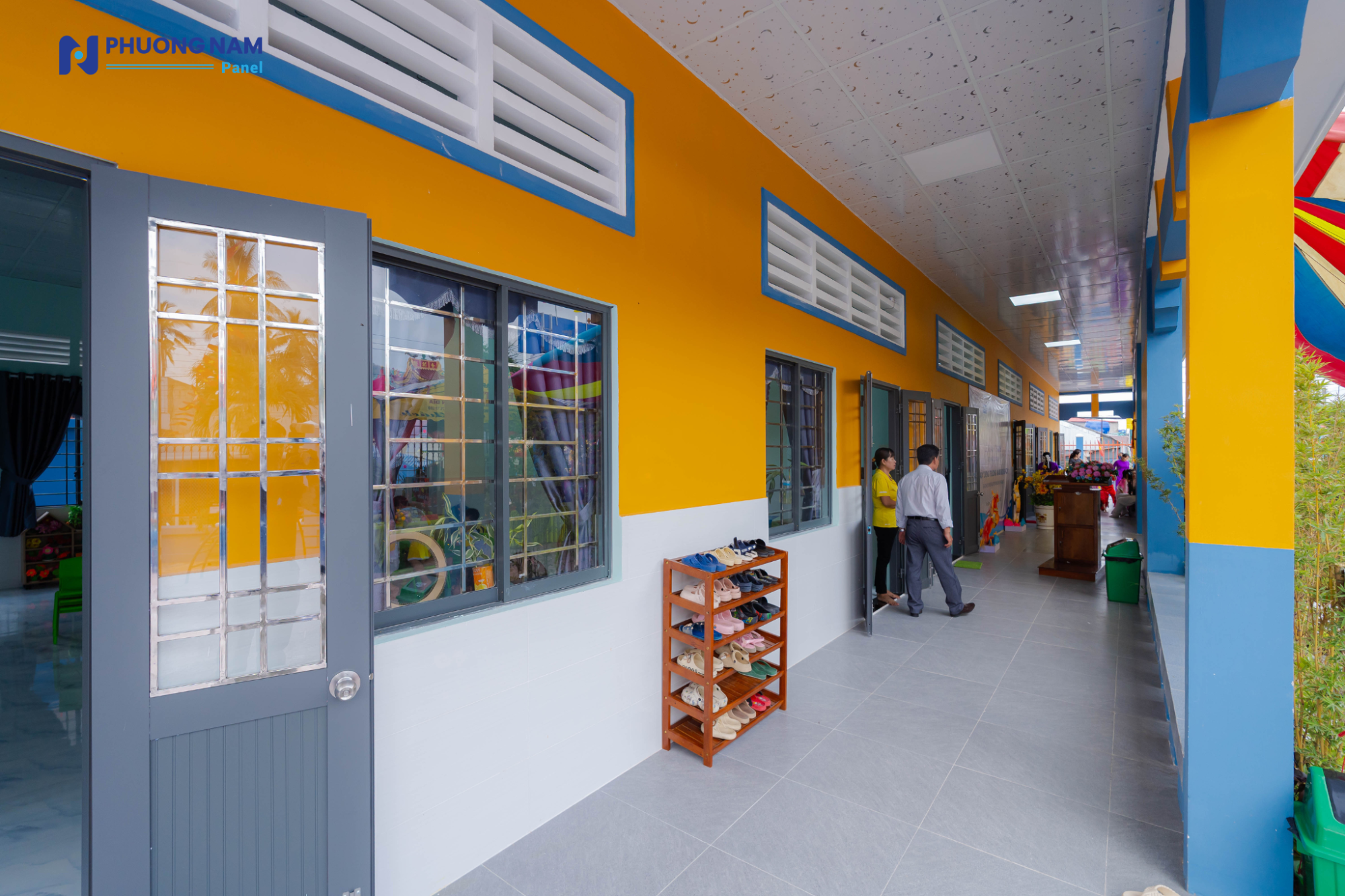 Đáng chú ý, công trình được ứng dụng các giải pháp vật liệu hiện đại nhằm đảm bảo sự thoải mái và an toàn cho trẻ nhỏ. Ngôi trường mới được lợp bằng các tấm lợp Procy cách âm, cách nhiệt do Phương Nam Panel tài trợ, sản xuất trên dây chuyền công nghệ châu Âu và sử dụng nguyên liệu đầu vào từ BASF. Giải pháp này giúp tối ưu điều kiện nhiệt độ, giảm tiếng ồn, từ đó tạo nên không gian học tập ổn định và dễ chịu cho các em trong suốt quá trình sinh hoạt và học tập.