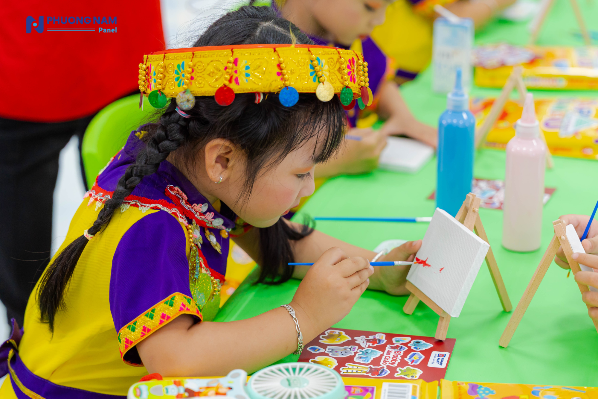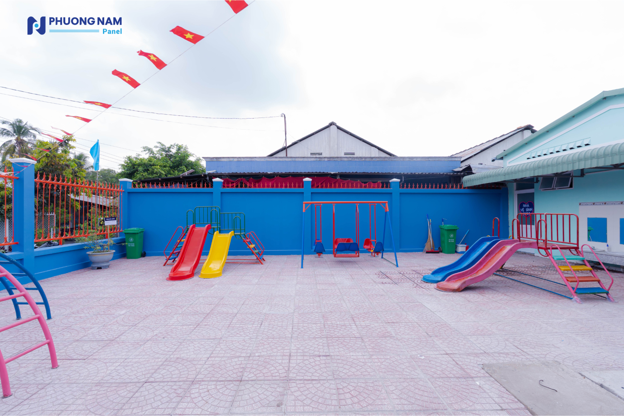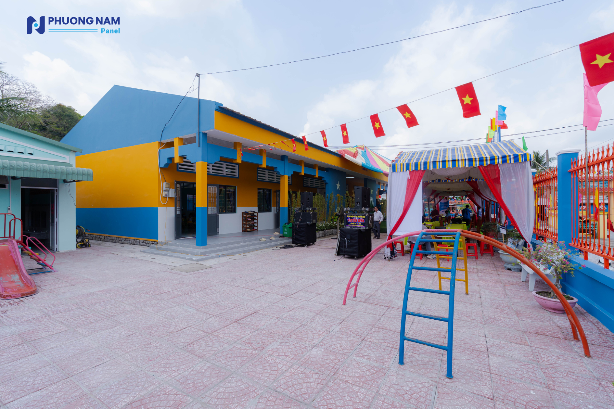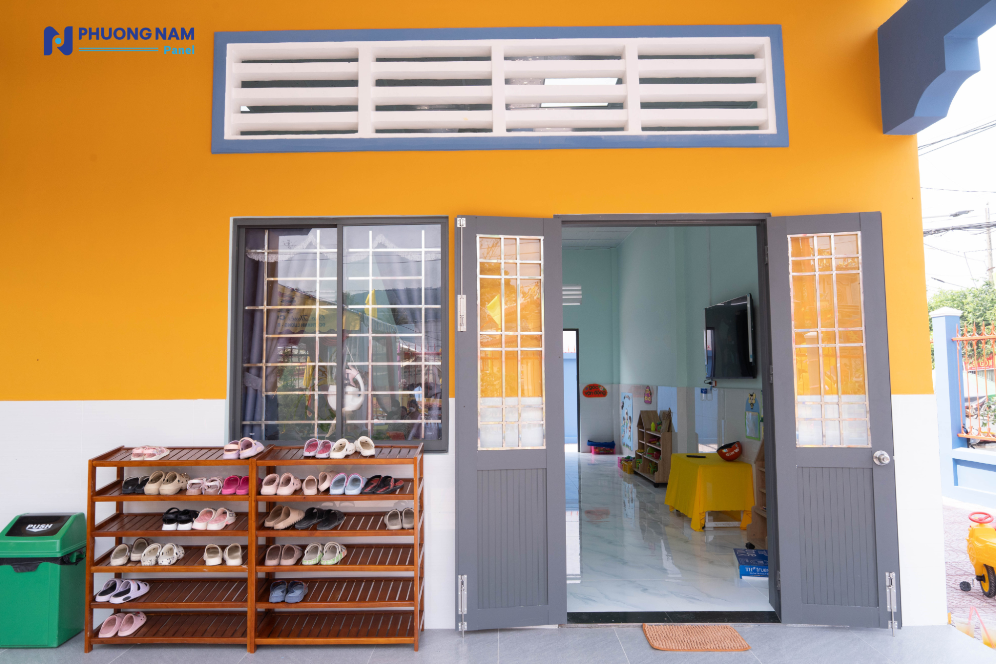 Đáng chú ý, công trình được ứng dụng các giải pháp vật liệu hiện đại nhằm đảm bảo sự thoải mái và an toàn cho trẻ nhỏ. Ngôi trường mới được lợp bằng các tấm lợp Procy cách âm, cách nhiệt do Phương Nam Panel tài trợ, sản xuất trên dây chuyền công nghệ châu Âu và sử dụng nguyên liệu đầu vào từ BASF. Giải pháp này giúp tối ưu điều kiện nhiệt độ, giảm tiếng ồn, từ đó tạo nên không gian học tập ổn định và dễ chịu cho các em trong suốt quá trình sinh hoạt và học tập.